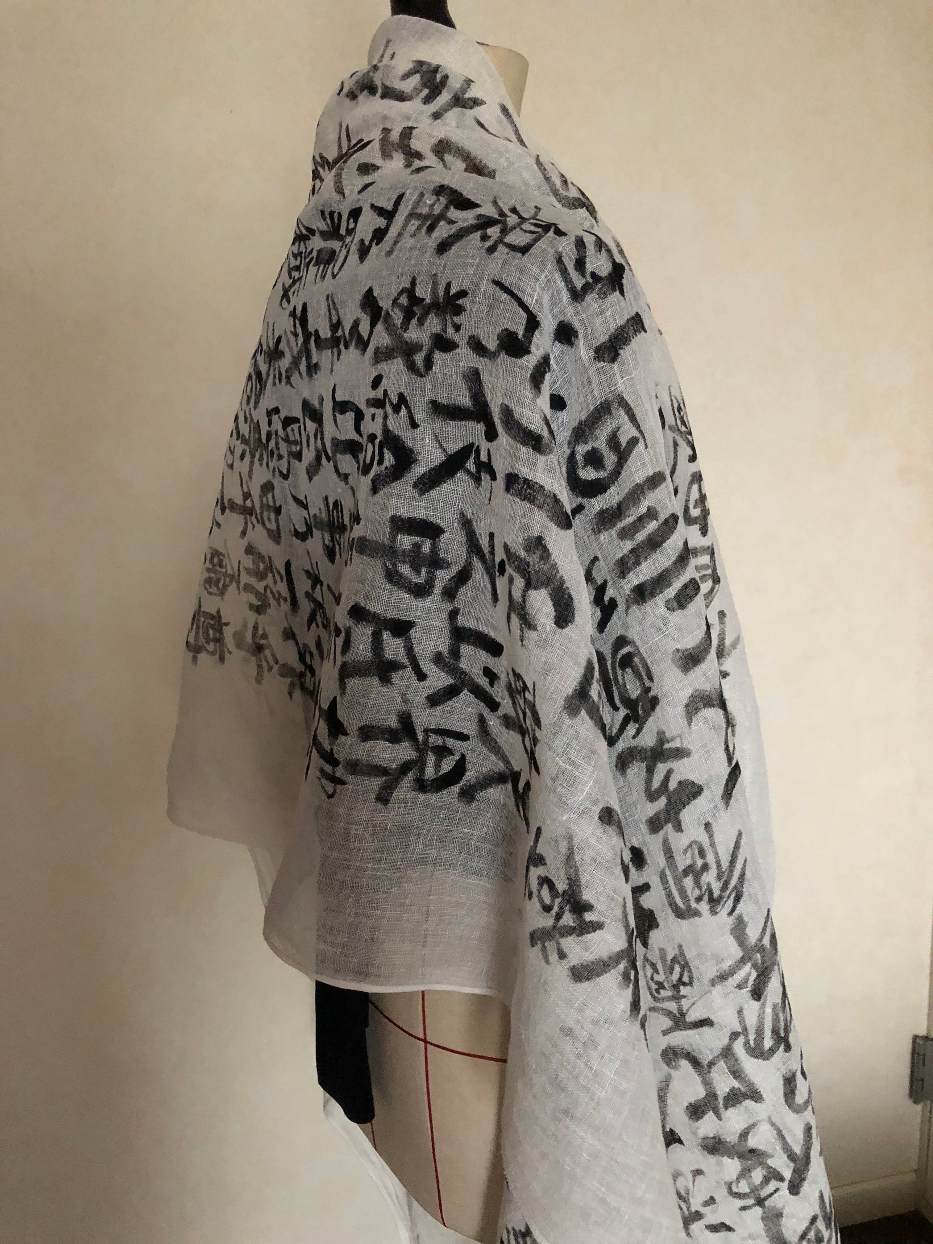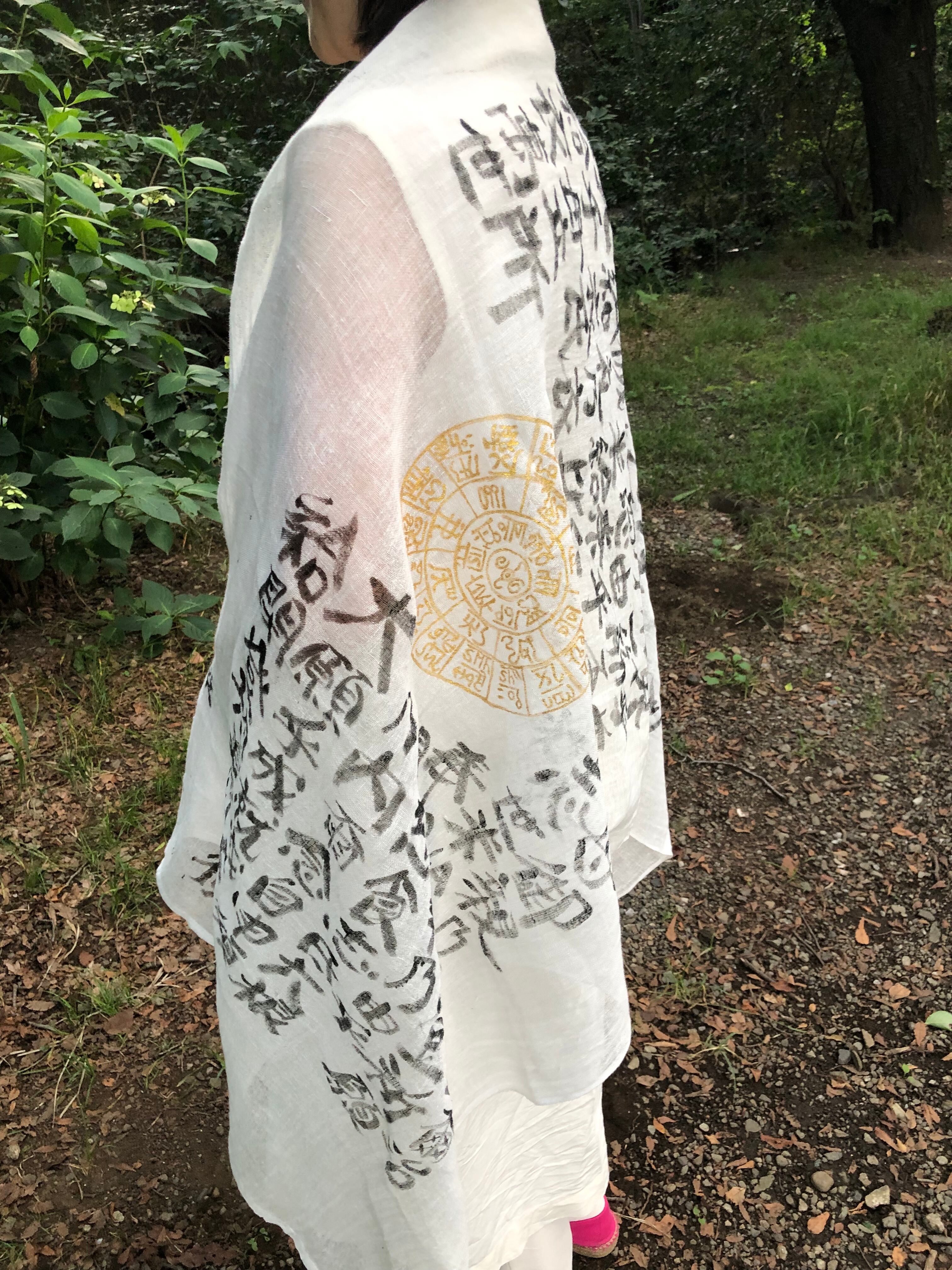 すっきりとした白地に、迫力満点の龍文字たちが描かれたショールです。長さ約195cm幅約75cmというボリューム感が、まさに龍の存在感を表しています。素材はさらっとした肌触りのヘンプガーゼで、軽くて扱いやすいのがポイント。また、大切な方への贈り物にもぴったり