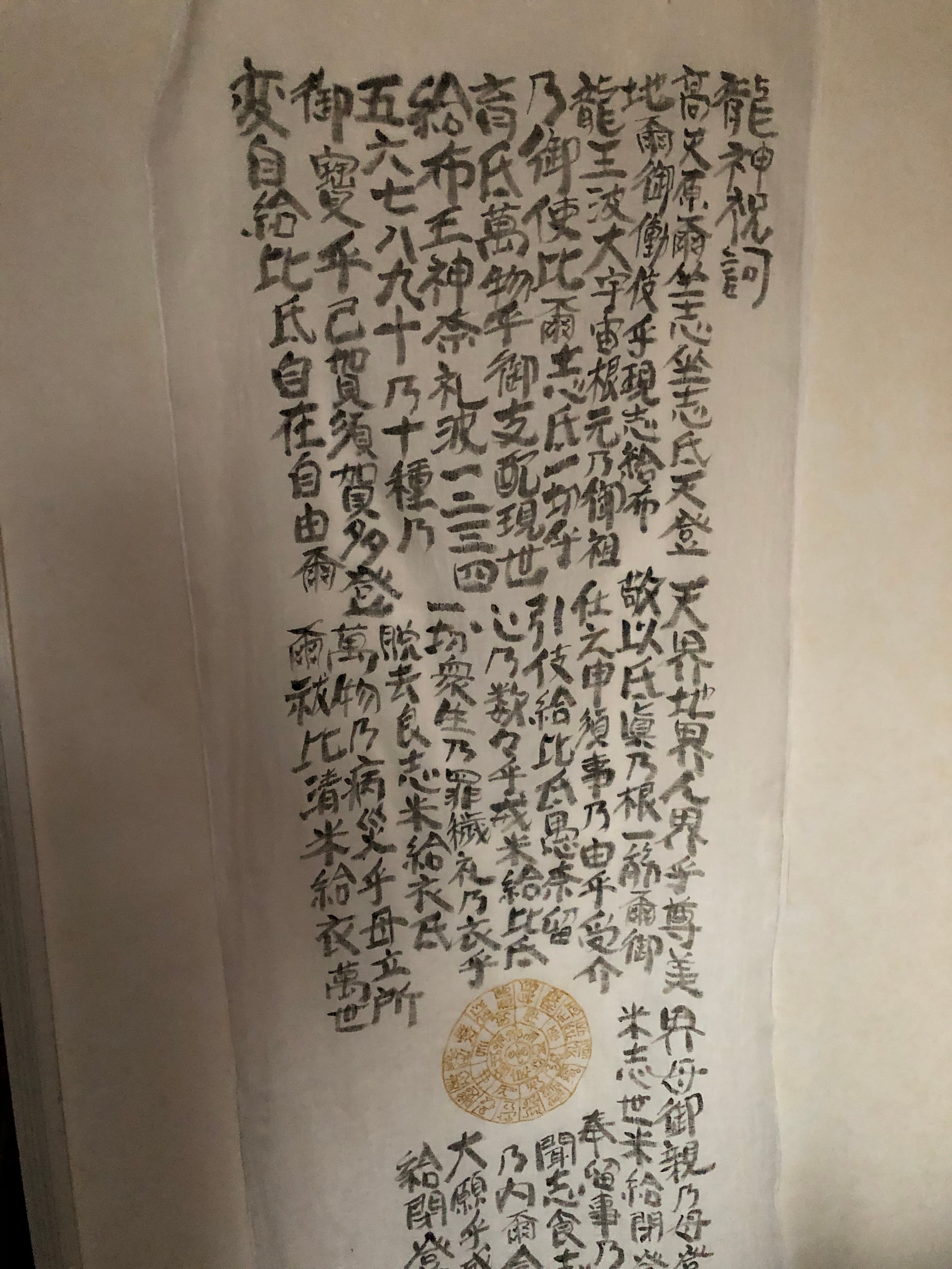 このショールのデザインは、獅子舞やちょうちん流しなど、盆踊りの楽しみを愛する人々からご好評をいただいています。しかしその起源は、古代日本における神事の一環である「龍神祭」にあります。この祭りでは、龍神に感謝を捧げるお祝いの言葉として「フトマニ龍神祝詞」が歌われます。このショールには、その祝詞も細かく手書きされています。