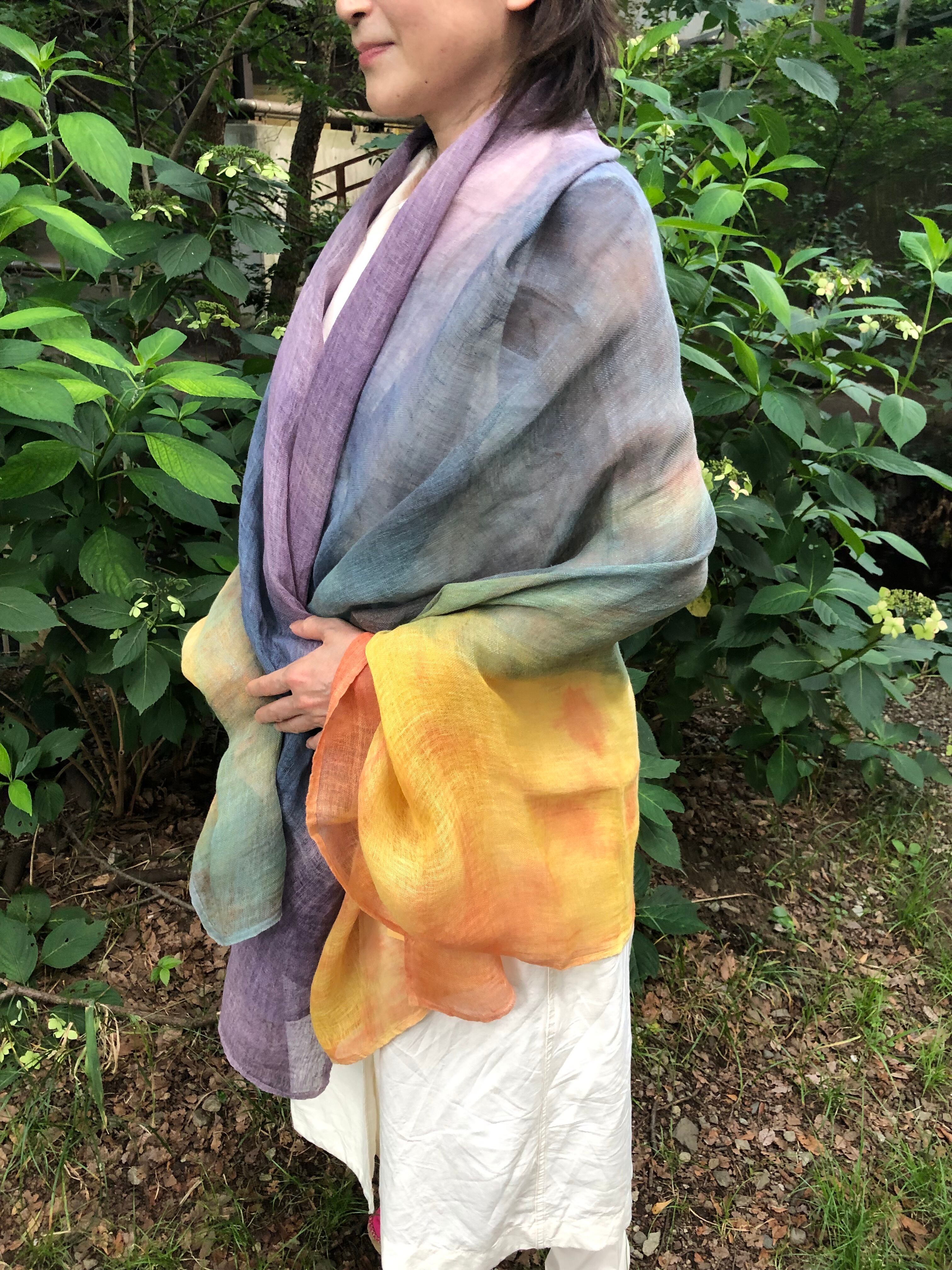 大人気の大判ヘンプ草木染めショールを身に纏い、優雅な時間を過ごしませんか?ぜひ、ご自分へのご褒美や特別な日のギフトに、お選びください。ただし、自然素材のため、色落ちする可能性がございますので、他の衣類との摩擦や汚れにはご注意ください。